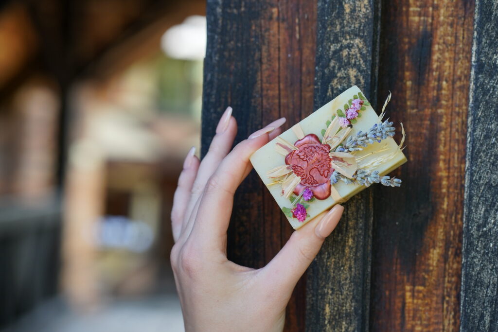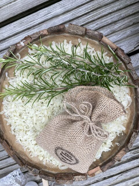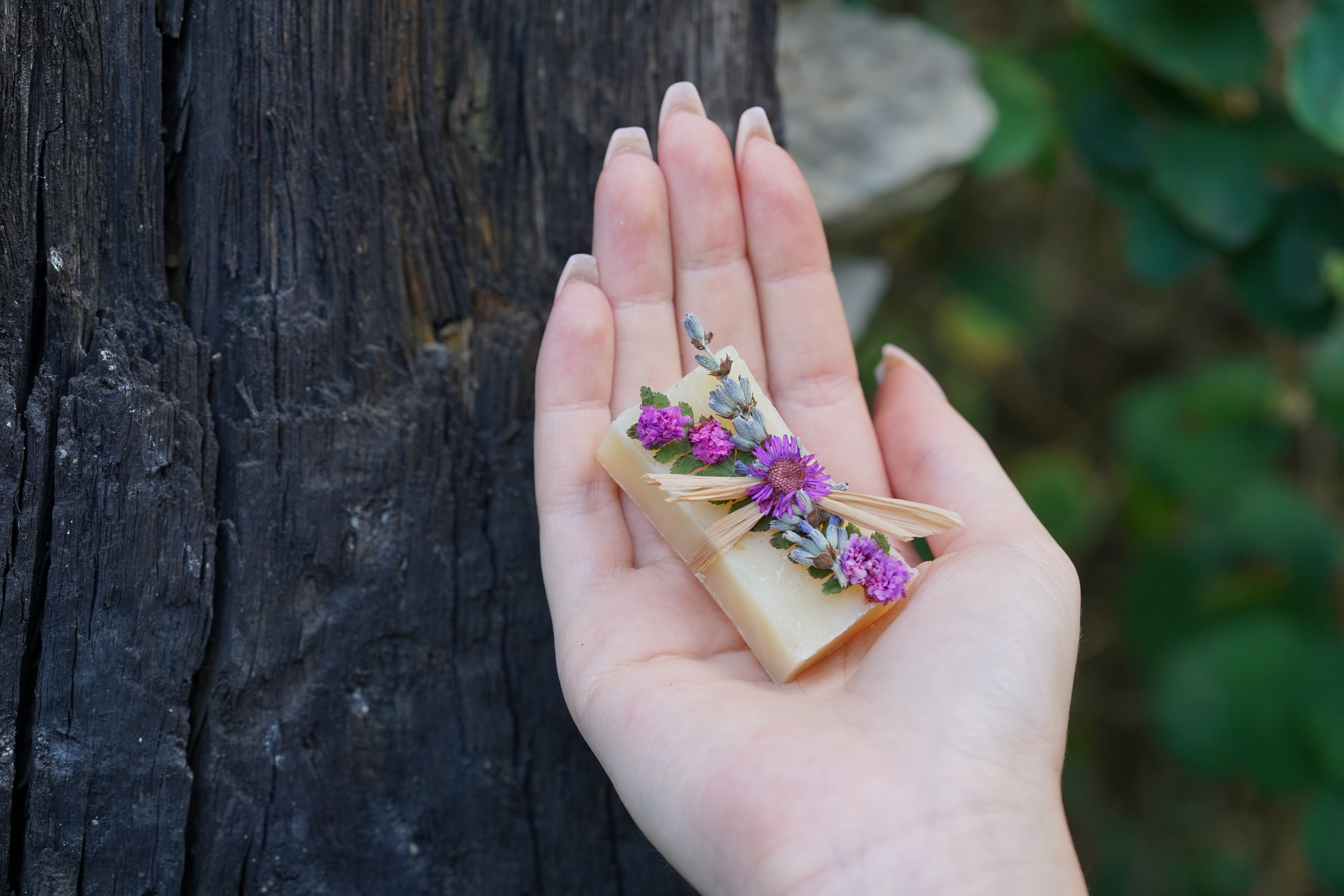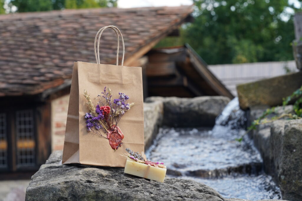 - Verpackte Block-Seife, optional mit Trockenblumen verziert